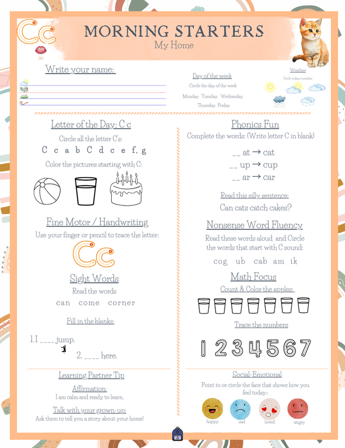 Each page encourages independent learning and meaningful interaction with caregivers, making mornings both educational and joyful. Perfect for kindergarten classrooms, homeschooling, or anytime learning at home.